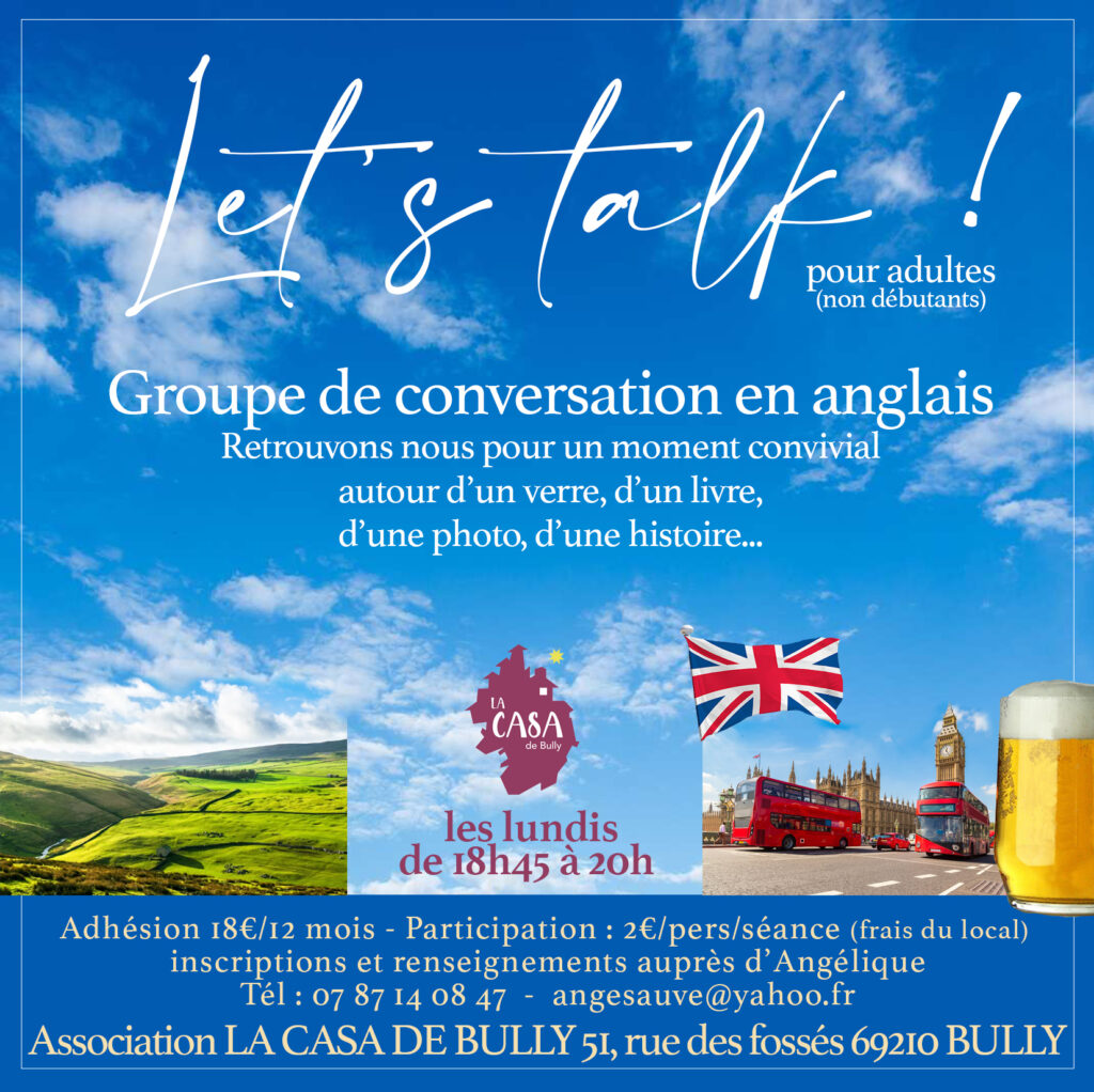 Angélique vous propose un rendez-vous très sympa, se réunir au local pour échanger dans la langue de Shakespeare. Les lundis de 18h45 à 20h, en toute décontraction !
